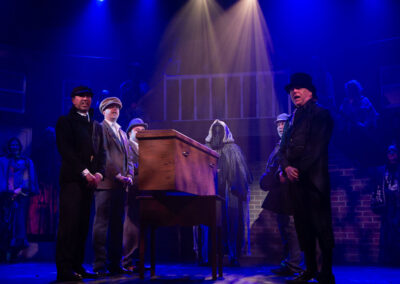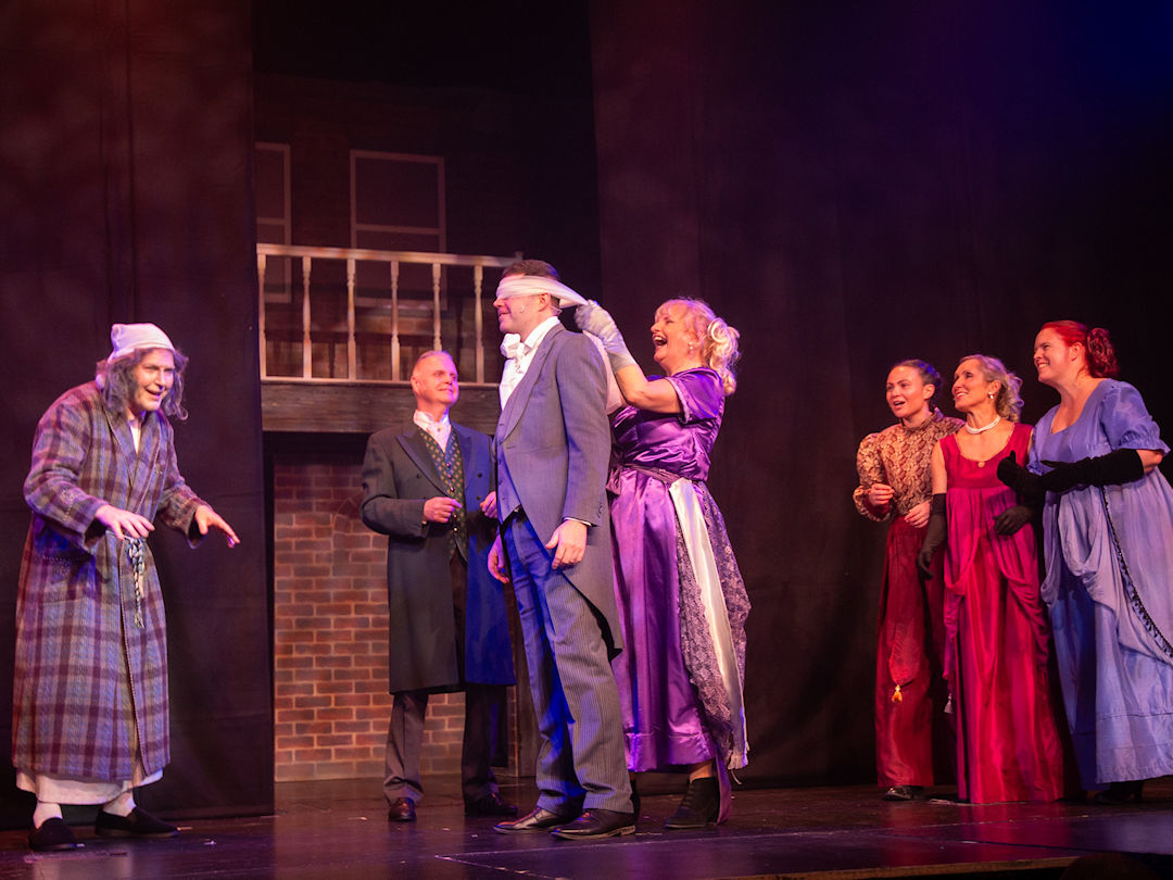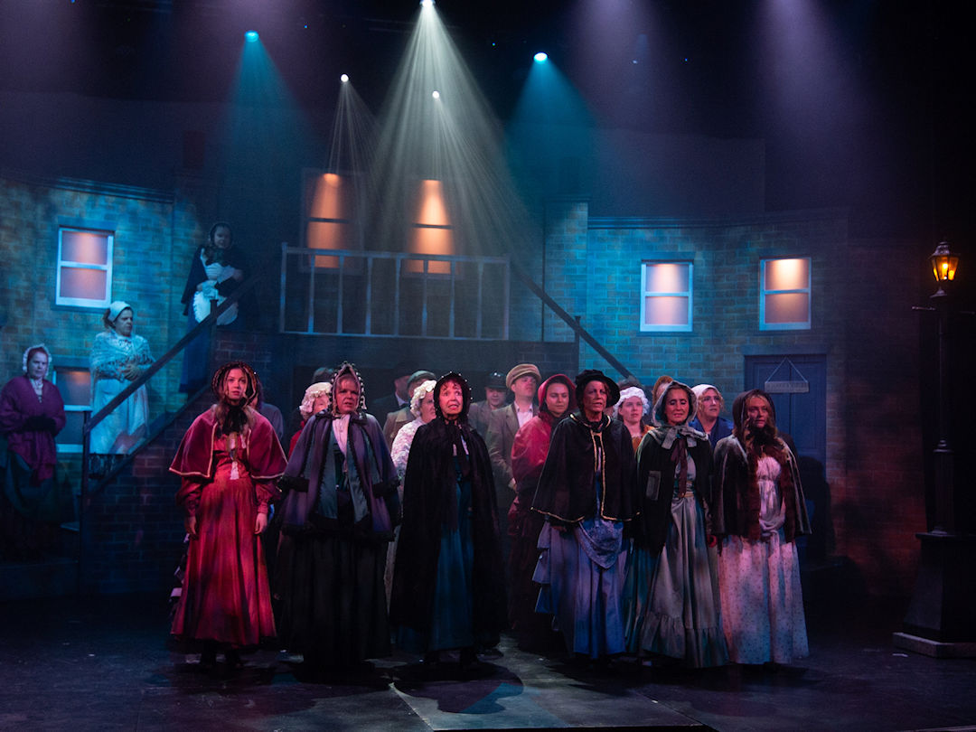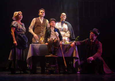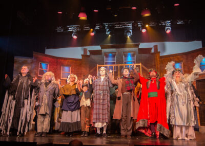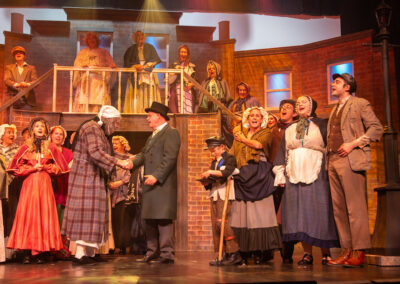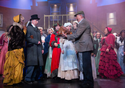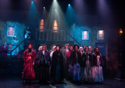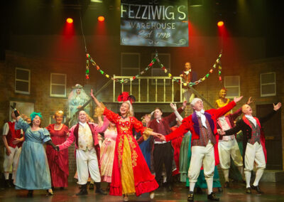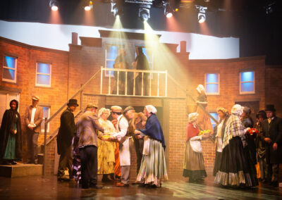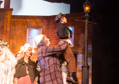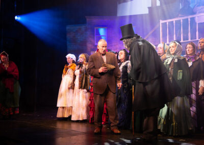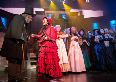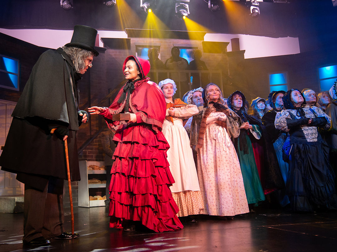 The whole production team deserve recognition for transforming the stage into Victorian London in 1843. Authenticity was further enhanced through carefully considered and stunning costumes, character-changing wigs and make-up, expressive choreography, and imaginative lighting and sound effects. The precise top quality orchestration brought everything together, offering the audience a memorable piece of live theatre and a beautifully presented retelling of one of Charles Dickens’ most enduring characters – the miserable, miserly Ebenezer Scrooge and his salvation.