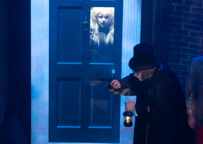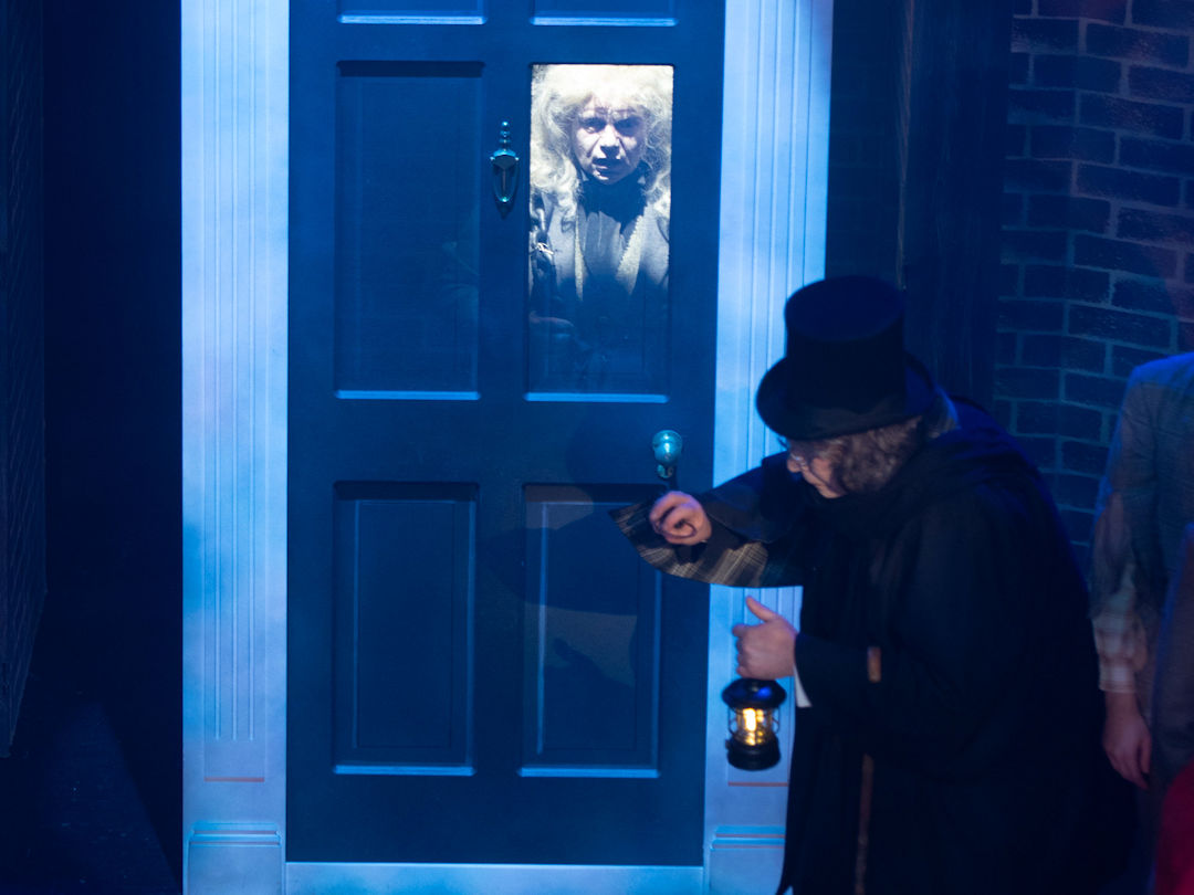 The curtains opened onto a very good set, depicting a Victorian London street. This immediately set the scene perfectly, and the effective staging continued throughout the show as other elements were flown in to depict locations such as Scrooge’s offices, front door (complete with creepy Marley apparition) and parlour. Atmospheric lighting also enhanced the mood throughout.