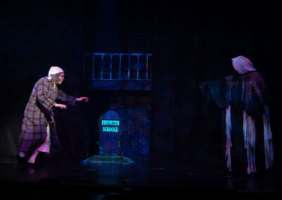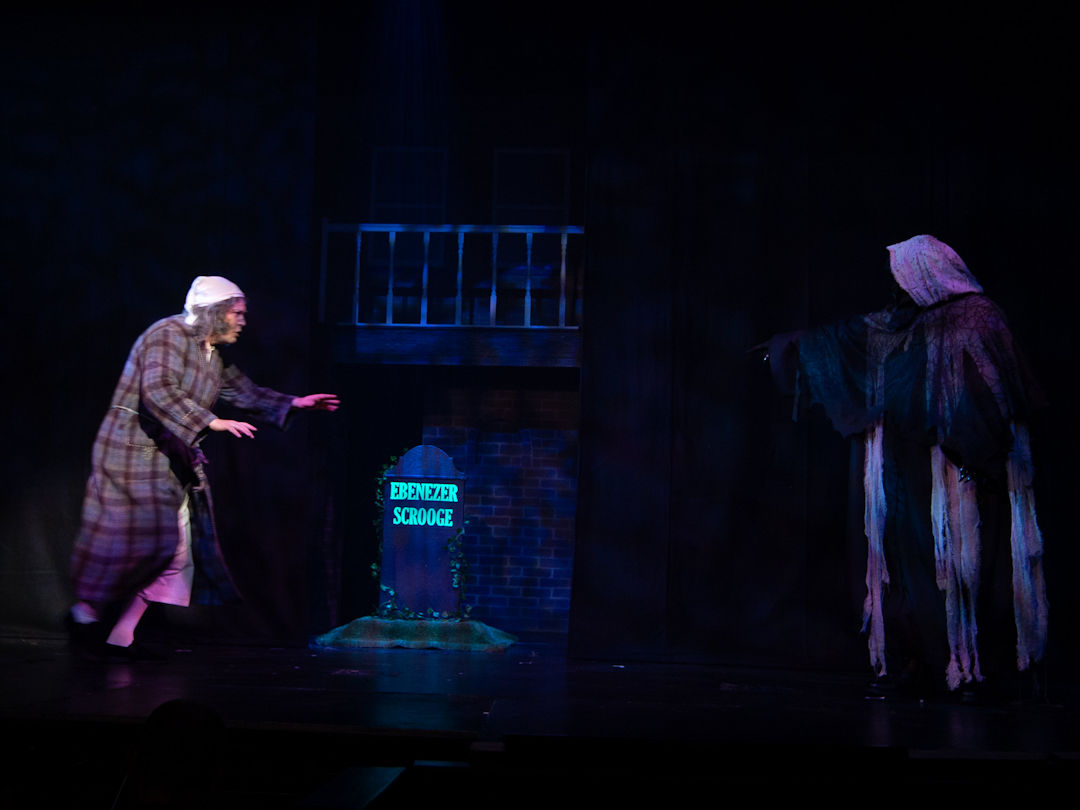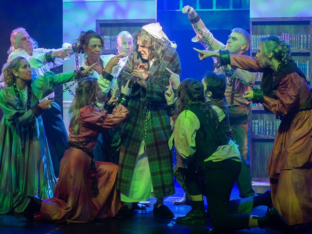 Edward Stokes has played the character of Ebenezer Scrooge once before and it showed, as he was immediately confident and comfortable in the role, showing very clear and strong characterisation. His excellent performance anchored the show superbly, providing a solid, familiar characterisation of the famous miser that was instantly recognisable. It wasn’t long before he was being visited by Jacob Marley (John Reeves, sporting a very impressive hairdo), accompanied by a bevy of capering phantoms who warned Scrooge of the eternal torments that awaited him through song. There was some very effective choreography, courtesy of Paula Lacey, in this scene, as the phantoms danced around with disconcerting grins on their faces.
